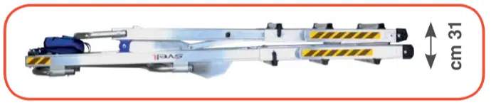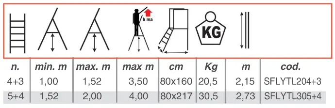 Telescopic ladder with platform according to the European UNIEN131/7 standards. Made of ribbed extruded aluminum with a telescopic extension equipped with a 360° guardrail. Fitted with wideners at the base, allowing the ladder to pass the anti-tip tests required by the European standard UNIEN131.7 to which the ladder complies. It combines the features of a telescopic ladder with those of a double ladder for a comfortable fit. With only 2 models, it can be used at various working heights. It can be used at an angle on ladders or slopes. When closed, it is compact and easy to transport.